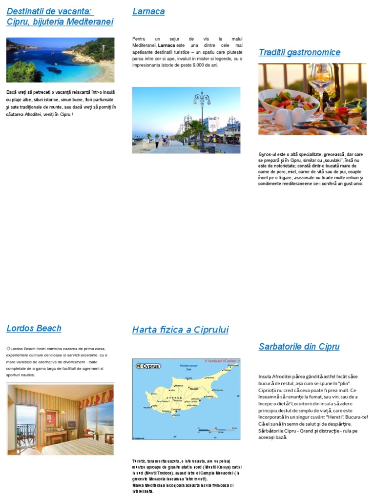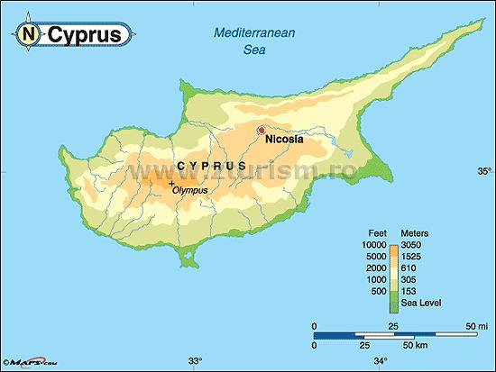 Cei activi din fire se vor bucura de drumețiile ce pot fi făcute pe munții de pe insulă. Cipru este a treia insulă ca mărime din marea mediterană după sicilia și sardinia. Cei activi din fire se vor bucura de drumețiile ce pot fi făcute pe munții de pe insulă. Plaje mediteraneene insorite, sate fermecatoare si ruine ale. Poti afla pe harta pozitia geografica pentru insula cipru in europa, care jumatate din insula apartine greciei iar jumatate turcia, o insula situata in artea de sud a turciei.